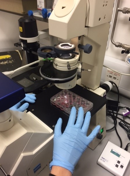 A part of my job is to grow healthy human cells in ‘microtiter plates’ (pictured below). These have round glass coverslips on the bottom, to which the cells attach as they grow. Today I have treated them with siRNA, to silence C9ORF72 production and in the next two days, I will analyse the cells under the microscope.”